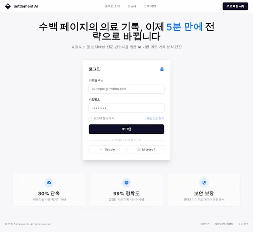 - 제품 정의: Settlement AI는 교통사고 및 산재 전문 로펌을 위해 의료 기록 분석과 보험사 대응 합의 전략을 자동 생성하는 AI 기반 SaaS 솔루션입니다.