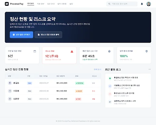 - 근로기준법 기반 정산 엔진: 중도 입퇴사자의 기본급 일할 계산, 주휴수당, 미사용 연차 수당을 1원 단위까지 자동 산출하며, 2024년 최저임금 및 최신 판례 로직을 적용하여 계산 오차를 0%로 유지함.