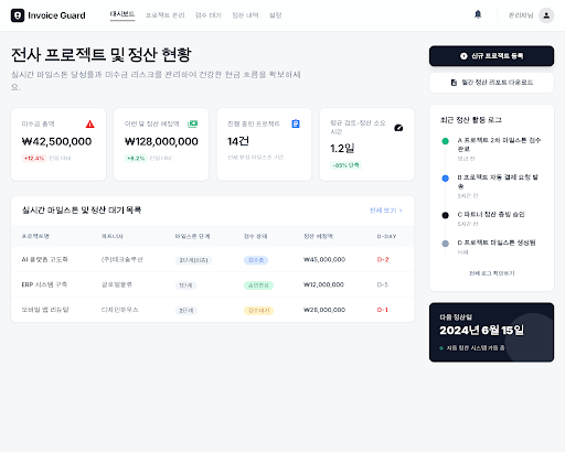 - 서비스 정의: Invoice Guard는 IT 에이전시의 외주 프로젝트 마일스톤 승인과 송장 발행 프로세스를 실시간으로 동기화하여 정산 지연과 미수금 분쟁을 원천 차단하는 정산 자동화 솔루션입니다.