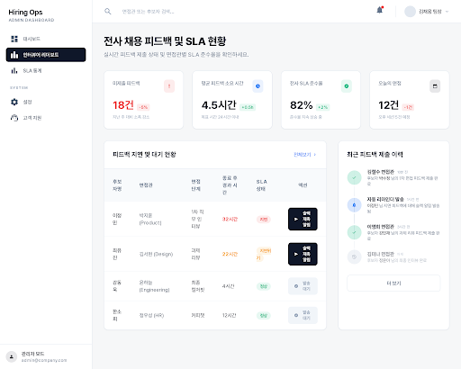 - 면접관별 평균 피드백 소요 시간, SLA 준수율, 피드백 텍스트 길이를 수치화한 ‘인터뷰어 리더보드’를 구축하여 조직 내 건강한 채용 기여 문화를 조성하고 우수 면접관을 포상하는 근거를 제공합니다.