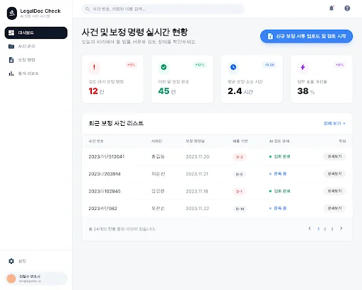 LegalDoc Check의 사용자 경험은 법률 사무원의 기존 업무 흐름을 방해하지 않으면서도, 서류 검토 시간을 90% 이상 단축하는 데 초점을 맞춥니다. 사용자는 대시보드에서 오늘 처리해야 할 보정 대상 사건을 한눈에 파악하며, 드래그 앤 드롭 방식의 파일 업로드로 즉각적인 분석을 시작합니다. 시스템은 React 기반의 단일 페이지 애플리케이션(SPA)으로 구축되어 끊김 없는 상태 전환을 보장합니다.