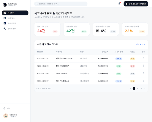 - [In-Scope] 사고 이력 대시보드: 업체별 사고 발생 건수, 리포트 생성 현황, 보험금 청구 대기 상태를 한눈에 파악할 수 있는 기본 관리 대시보드를 구축합니다.