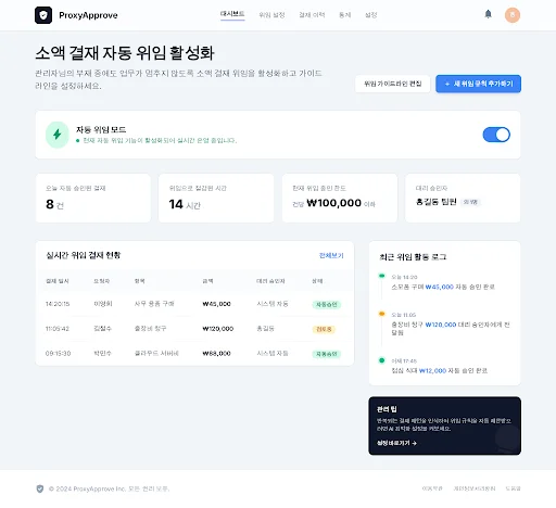 - 심리적 안전장치: 모든 대리 승인 건에 대해 ‘승인 즉시 관리자에게 요약 알림’ 및 ‘주간 감사 리포트’를 자동 생성하여, 관리자가 통제권을 유지하고 있다는 심리적 확신을 제공합니다.