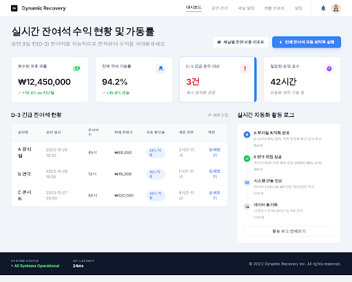 - 경제적 타당성: Dynamic Recovery는 월 35만 원의 구독료로 운영 공수를 90% 절감하며, 단 8석의 추가 판매만으로 14일 이내에 솔루션 비용을 전액 회수할 수 있는 명확한 ROI를 제공합니다.