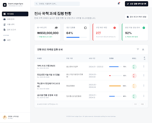 - Grant Ledger Sync는 TIPS, R&D 과제 등 다수의 정부 보조금을 동시 운영하는 스타트업을 위해 회계 데이터와 보조금 집행 지침을 실시간 대조하고 감사 증빙 보고서를 자동 생성하는 SaaS 솔루션입니다.