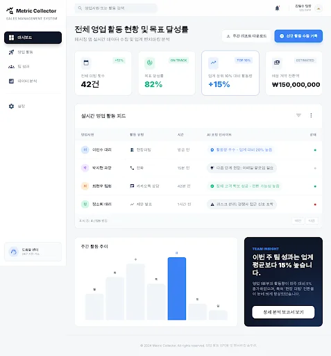 /dashboard: 팀 전체 활동 지표 및 실시간 목표 달성률 대시보드/activities: 영업 사원별 미팅 로그 및 AI 상담 품질 점수 상세 조회/benchmark: 업계 상위 10% 성과 데이터와의 정량적 비교 분석 뷰/reports/weekly: AI 기반 주간 성과 진단 및 팀장용 코칭 리포트 생성/settings/integration: 슬랙 및 카카오톡 채널 연동 및 웹훅 관리 설정/admin/organization: 조직 구조 설정, 팀원 초대 및 요금제 구독 관리/coaching/guide: 개인별 맞춤형 행동 교정 지침 및 실천 항목 리스트
